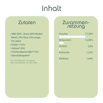 Inhalt: Das Hundefutter-Menü für den Abend enthält viel Muskelfleisch, Herz, Lunge und Leber vom Wild und hat daher einen hohen Fleischanteil. Auch die übrigen Zutaten in diesem natürlichen Hundefutter können sich sehen lassen: Der Kürbis im Futter enthält Kalium, das Eierschalenpulver des Nassfutters versorgt Ihren Hund mit Kalzium. Kalium und Kalzium sind essenziell für den Muskel- und den Knochenstoffwechsel des Hundes und stärken damit Muskeln und Knochen.