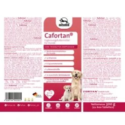 CAFORTAN® das biologisch-spezielle Kraftkonzentrat steigert durch lebens- und leistungsnotwendige Nährstoffe die allgemeine Widerstandskraft, fördert Knochen- und Zahnbildung, gibt prachtvollste Behaarung, erhöht Futterausnutzung und Leistung, kompensiert die häufigen, nachteiligen Ernährungsfehler (z. B. bei einseitiger Fütterung aus Dosen, von Trockenfutter oder vom häuslichen Tisch), sichert Zucht- und Aufzuchterfolge.