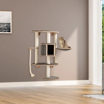 Der Kratzbaum wird an der Wand befestigt und bietet somit optimalen Halt. Die Kissen sind abnehmbar fĂŒr eine leichte Reinigung. Ihre Katze kann sich an den SisalstĂ€mmen die Krallen wetzen oder es sich auch einfach nur in der HĂ€ngematte bequem machen. Das Tau sorgt fĂŒr zusĂ€tzlichen SpielspaĂ.