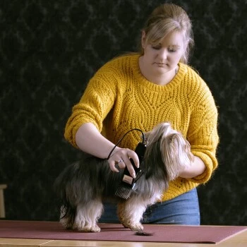 Scheren / Trimmen: Das Tier soll individuell nach seinem Felltyp und der Rasse gepflegt werden. An die gewünschte Schnittlänge herantasten, zum Beispiel mit unterschiedlichen Aufschiebekämmen, von groß nach klein, vorerst an einer verdeckten Stelle testen.