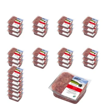 Unser Rind Vital mit einer Extraportion an Vitaminen und Mineralien: reines Muskelfleisch mit vielen gut verdaulichen Proteinen (Eiweißen) und Fleisch vom Herz werden in dem Rind-Mix kombiniert mit einem besonders hohen Anteil an Obst und Gemüse (30 Prozent) sowie grünem Pansen (30 Prozent). So stellt das Rindfleischmahlzeit die Versorgung mit zahlreichen Spurenelementen und Vitamin C sicher. Die im Pansen durch vorverdaute Pflanzenreste freigesetzten probiotischen Bakterien pflegen darüber hinaus die Darmflora Deines Hundes. Rind mit Gemüse – eine sehr bekömmliche Vitaminbombe. Unser Rind Vital ist frei von Gluten.